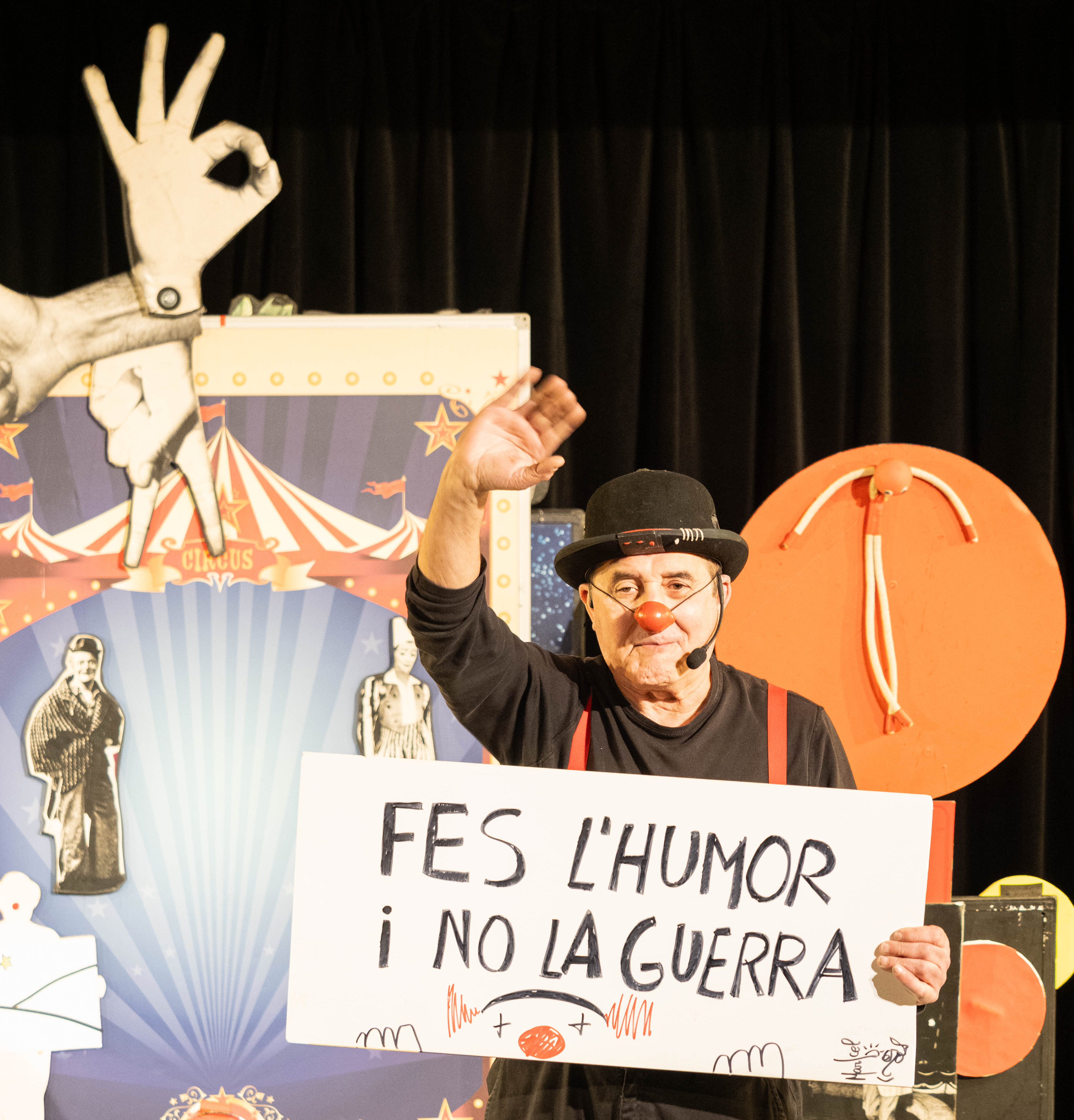 En Marcel vestit amb les seves sabates grosses, el nas de pallasso i el barret inconfusibles, ens va explicant amb un llenguatge poètic els temes escollits i el seu pensament, el seu univers sovint tranquil, sovint enginyós, amb silencis que parlen, amb els seus somriures, desgrana un espectacle per a tots els públics. L’entenem cadascú al nostre nivell, segons els nostres referents, mil i una idees si has seguit el seu consell de deixar volar la imaginació, però també de reflexió, fins al final de l’espectacle amb el cartell de “Fes l’Humor i no la guerra”.